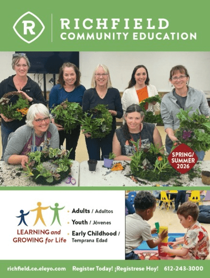 Richfield Community Education Spring and Summer registration is open now!¡Las inscripciones para la primavera y vernano ya están abiertas!Office Hours: 7:30 a.m. - 4:00 p.m. Click the picture of the Community Education catalog to view it as a PDF. Adult Enrichment Youth Enrichment Aquatics Preschool for 3s Prekindergartenfor 4s Early Childhood Family Education (ECFE) Early Childhood Screening Metro SouthAdult Basic Ed & ESL Learning Exchange Richfield Community Education & Early Childhood Programs Call, visit, or email us with questions or suggestions.Office Hours: 7:30 a.m. - 4:00 p.m.Address: Central Education Center7145 Harriet Ave S, Richfield, MN 55423Llame, visite, o envíenos un correo electrónico con sus preguntas o sugerencias. 612-243-3000 communityeducation@rpsmn.org 612-243-3007 earlylearning@rpsmn.org
