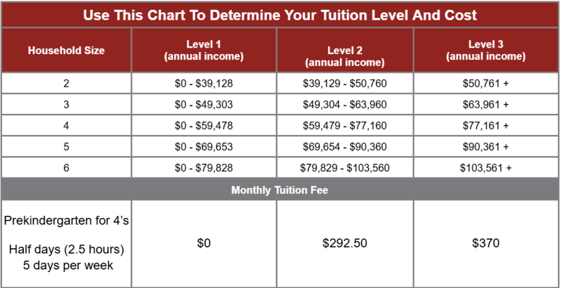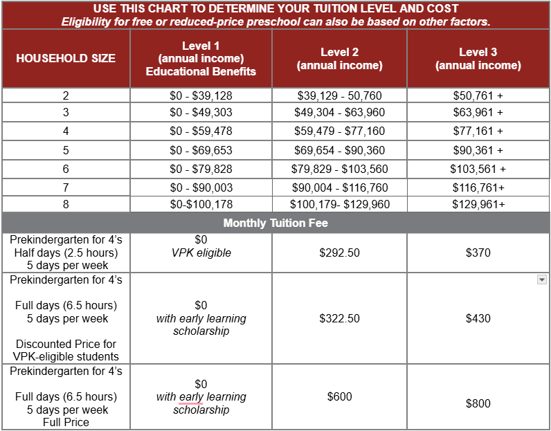Payment: Monthly Payments based on the fee scale below for students who do not qualify for a free Voluntary Prekindergarten seat.